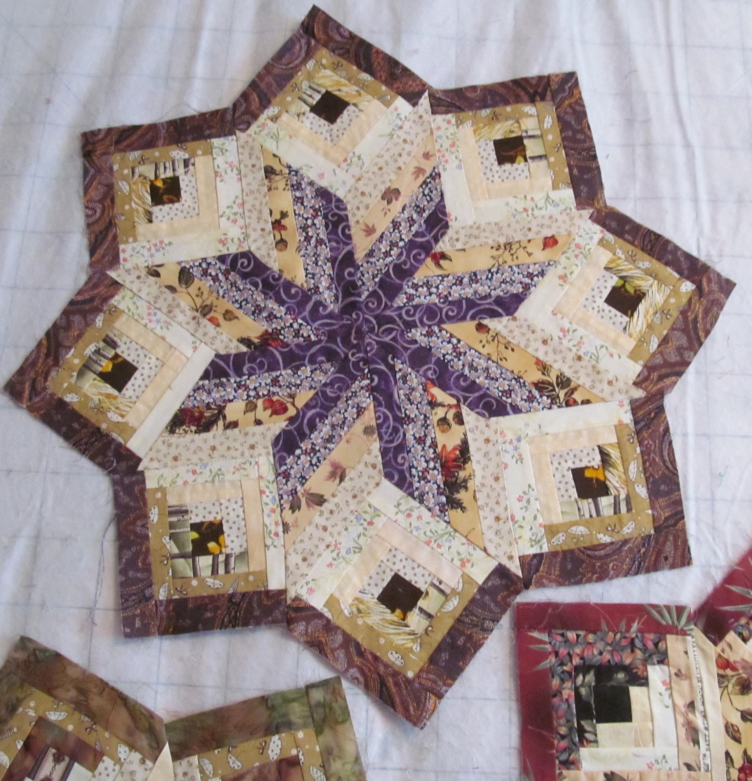 Обшила все 16 "звезд" блоками "изба" , а это 128 "избушек"... хоть и легко их шить, но утомительно. Красота получается восхитительная (на мой вкус):-))) В основном, сиренево-фиолетовые тона.. даже сын заметил: "Мама, ты фанат сиреневого.."